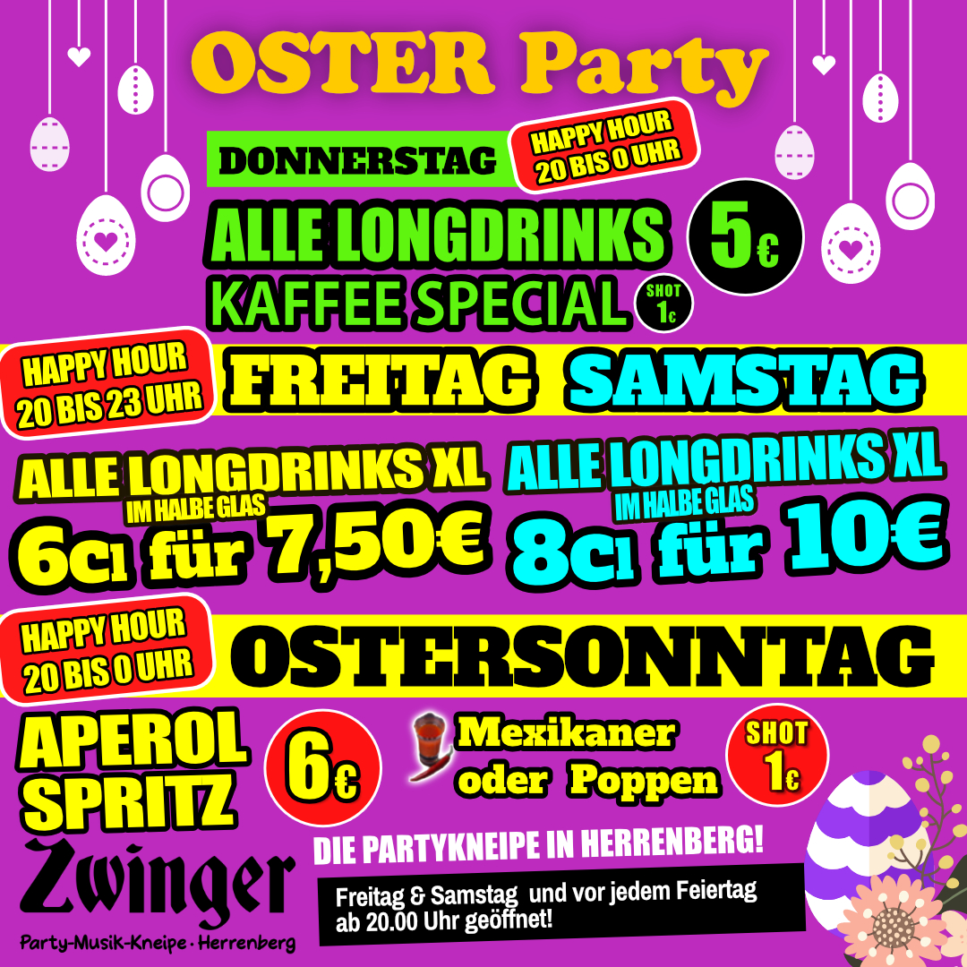 🐇🥚das Osterwochenende steht vor der Tür! Das bedeutet 4 heiße Partynächte im Zwinger! 🎉🎊Los geht es am Donnerstag ab 20 Uhr. Wir haben für euch über das Osterwochenende besondere Getränkespecials vorbereitet.